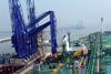 A wide angle short of a ship at berth at Mumbai Port