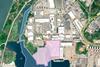 A aerial shot with pink and blue markings indicating the areas being acquired by the Port of Gothenburg